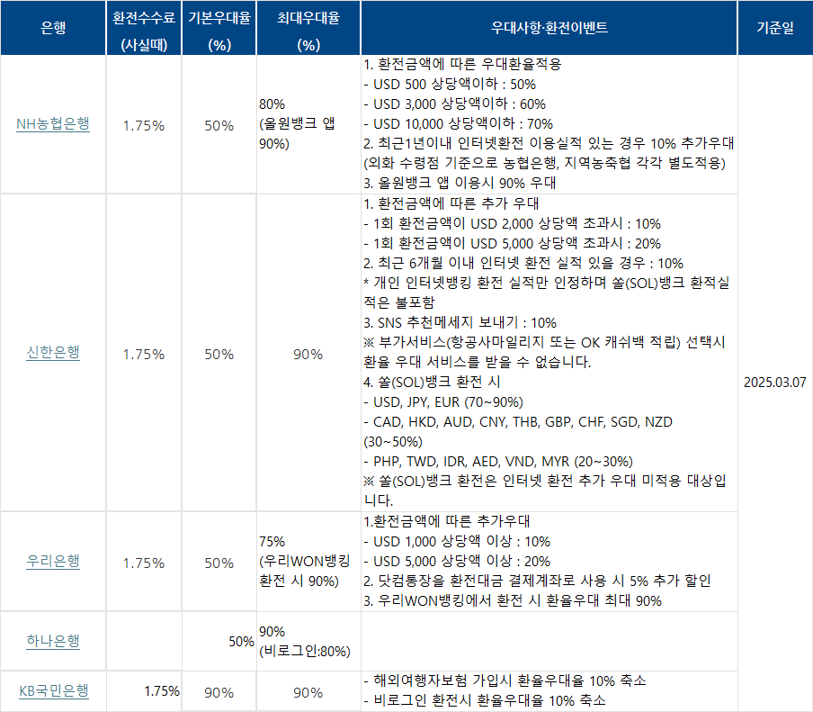 - 환전수수료율이 낮은 은행이 무조건 유리한 것은 아니므로 환전 금액과 주거래 여부 등 비교하고 확인하여 선택!